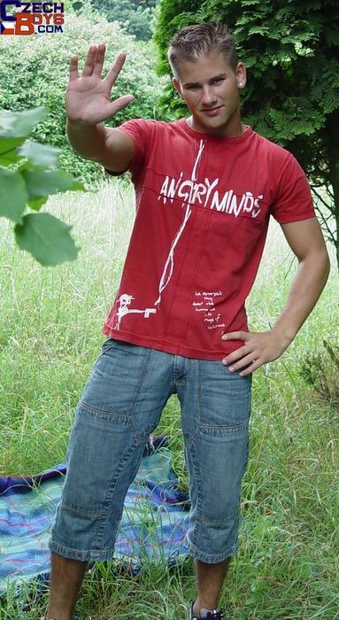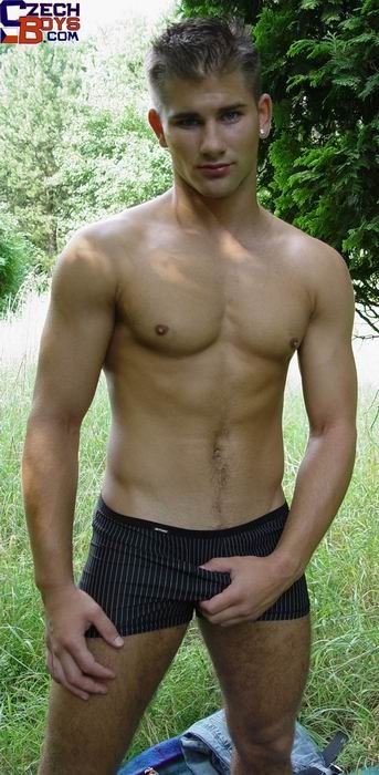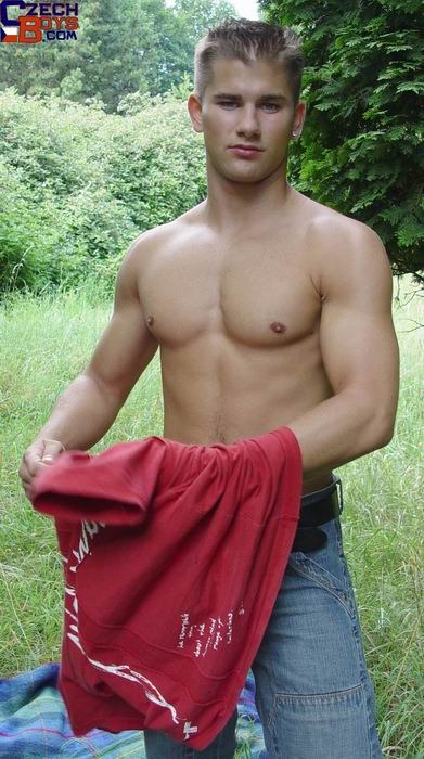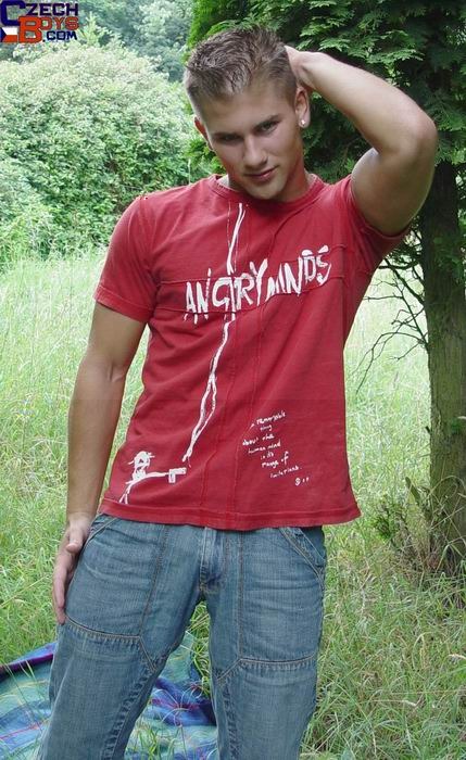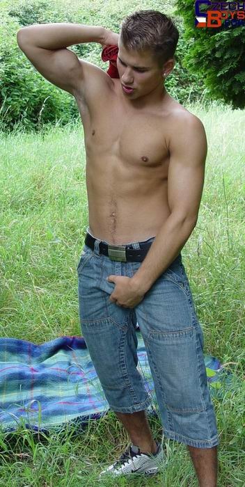 Jan Krasny is one aptly named twink – “krasny” means “beautiful” in Czech, and this 18 year old bisexual student is truly gorgeous. His perfect baby face is just the beginning – Jan also has a fantastic muscular body with great shoulders, smooth pecs and a sexy treasure trail that draws the eye down across his toned stomach to his very strong and hairy legs. Easy-going and up for anything, Jan was not at all shy about stripping naked in the lovely Czech countryside, showing us his great bubble butt and jerking off for the camera. And he lost his concentration only for a moment when a lady on a horse passed by and asked him what he was doing!