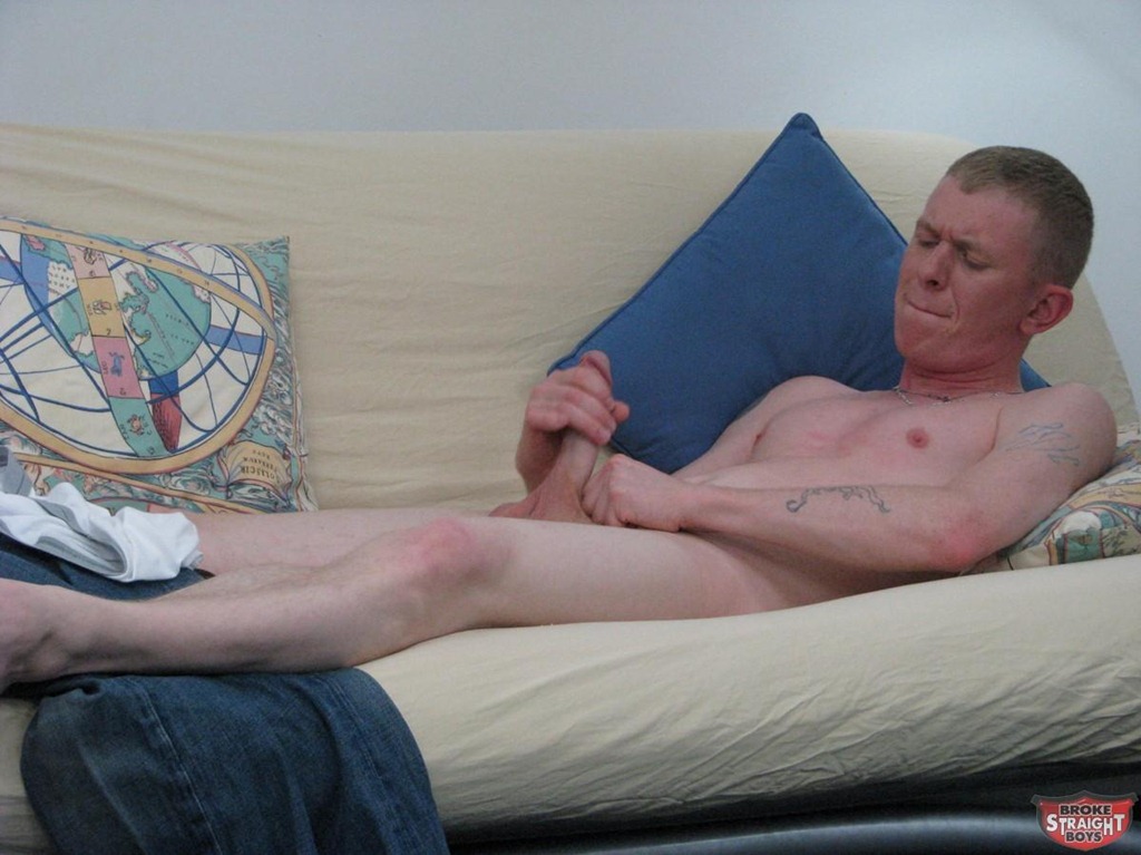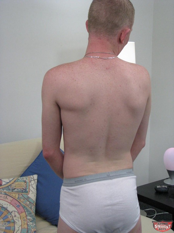 Broke Straight Boys has a newbie on the futon; Sean Carter. Even though Sean works as a sever in a restaurant, too many bills are sending him broke. 24 year old Sean is at BSB to do his solo shoot and make some money so that he can afford to move in with his girlfriend. Although he is straight, Sean knows that BSB is gay owned and operated and as such, is keeping an open mind about things. I got Sean to stand up and as he was taking off his t-shirt, he told me that he was 5′ 7″, 160 pounds and that his hair was more strawberry than blonde.