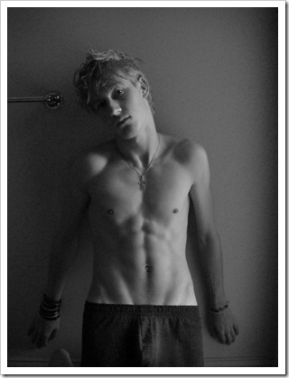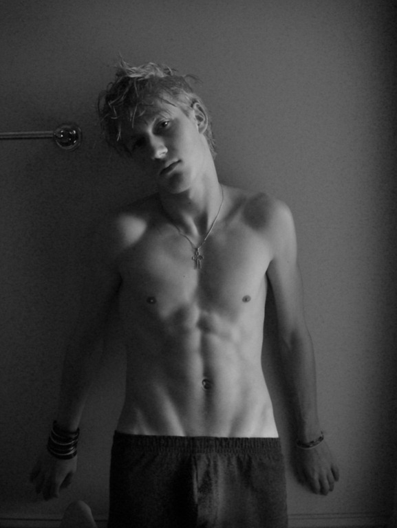 Ryan Carnes naked and covering his cock with bedsheets while spreading his legs