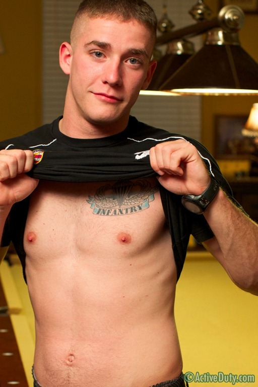 Active Duty offered another great War Chest Video Update and I am really excited about the new recruit they featured. Tatum is a really hot dude and Dink Flamingo said that as soon as he met Tatum he knew Tatum would most likely be down to play. Dink decided that Tatumís first solo was as good a time as any to see how far he might go. Luckily, Dink had a willing accomplice to help him out on his mission. Tatumís so adorable and I personally can’t get enough of that cute Southern drawl of his. Tatum is 20 years old and stands 5’10”. He’s got a great semi-furry tight body that weighs in at around 165 lbs. Tatum loves motorcycles and enjoys anything that gives him an adrenaline rush. He has a fear of heights but he’s found a way to get over that fear that he explains. Tatum is an Alabama boy and that sweet awe shucks attitude just drives me crazy. He’s got so much sex appeal it makes me melt. This guy is super horny and you can tell. When Dink finally decides to reveal his secret and tells Tatum that he has a Marine buddy in the living room who saw his pictures and said he’d suck him off. Dink asks Tatum if he thinks he might let him and he doesn’t hesitate to say yes. Dustin comes in and starts playing with Tatum’s big cock, jerking it and playing with his balls. Once Dustin knows Tatum is cool with it, he goes for it. As soon as his mouth touches Tatum’s cock it’s rock hard once again. It’s a big dick for Dustin to master, but he gives it a good try. Tatum throws his head back and starts biting his lips. You can tell this is a brand new experience for him but his dick is really liking it. Once he shoots his load, Dustin plays with his cum and rubs it all over his cock. And that’s all she wrote. He’s putting on his shorts and heading for the door just like any good piece of trade would. Gotta love it.