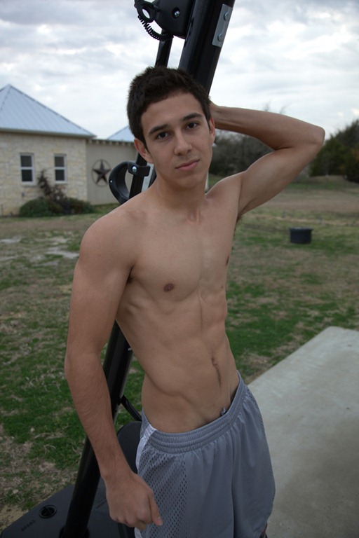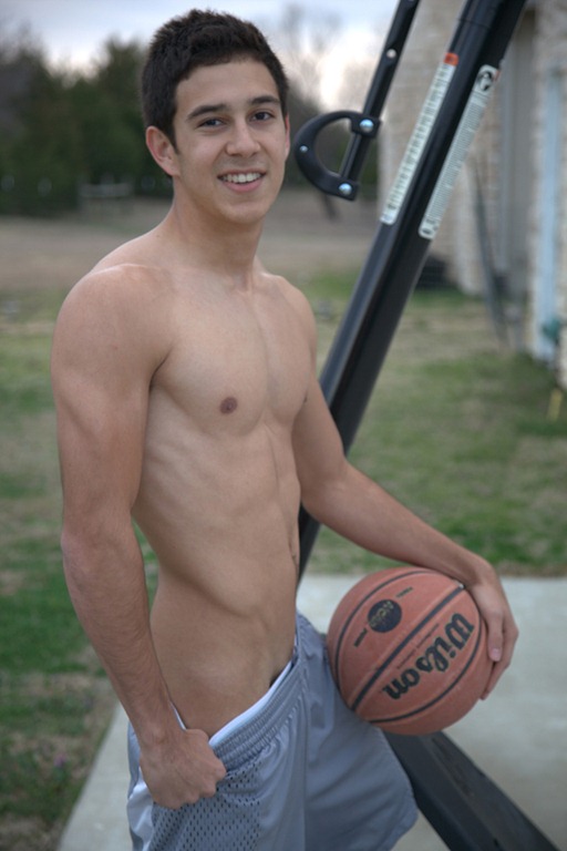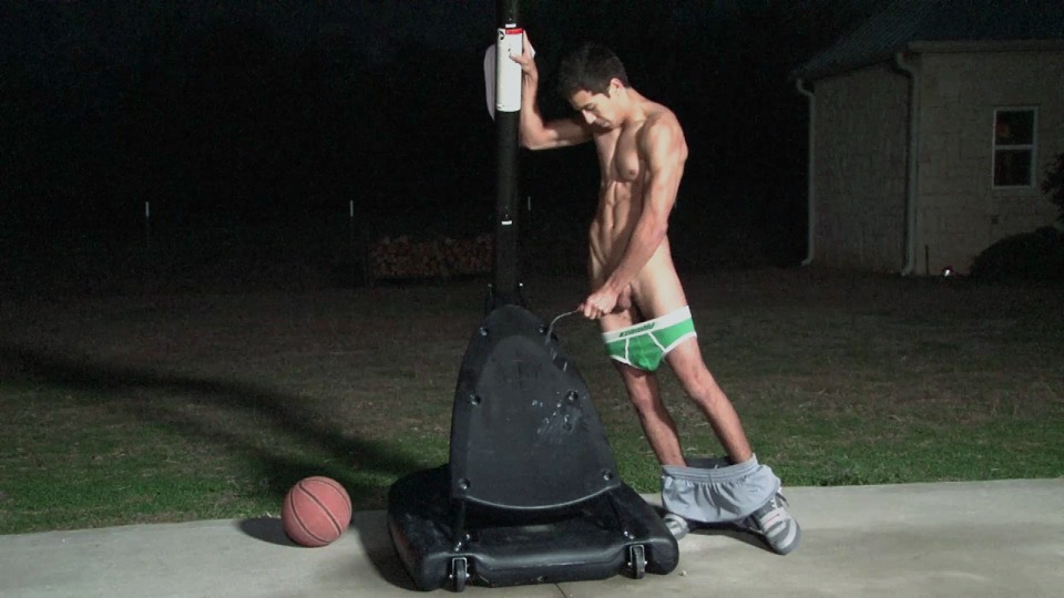 Joey was another one of those surprise visits to the Ranch.  Our boy Haigan brought a buddy with him one weekend and low and behold 19 year old Joey steps out of the car.  He had on a pair of jeans and a baggy shirt so I couldn‚t really get a good feel for his body so I had him remove his shirt.  Needless to say, we asked him to stick around for a while. A few hours later I caught Joey shooting some hoops outside so I decided to give his solo a shot.  As you will see, we started the video in the early evening and we all got so caught up in Joey that it went well on into the night.  Joey took off his shirt and sat back against the basketball frame and slowly started to stroke his big dick. Joey took his time making sure that we all got a good view of his tight body.  We asked Joey to tease us and that is exactly what he did∑.for about 3 hours.  He likes to work his cock slow and easy with long strokes back and forth wit his thumb wiping the precum from the tip of his mushroom head.  With every stroke, Joey‚s arms and chest would flex and pulsate right along with the shaft of his rod. Joey wasn‚t about to stop until he had given us all a complete show.  Keep in mind that he had been jacking off for a few hours so he was more than ready to explode.  With all that being said, we were all still shocked when Joey drenched the basketball stand with a steady stream of young stud baby batter.  We will make sure that there is plenty more of Joey to cum.
