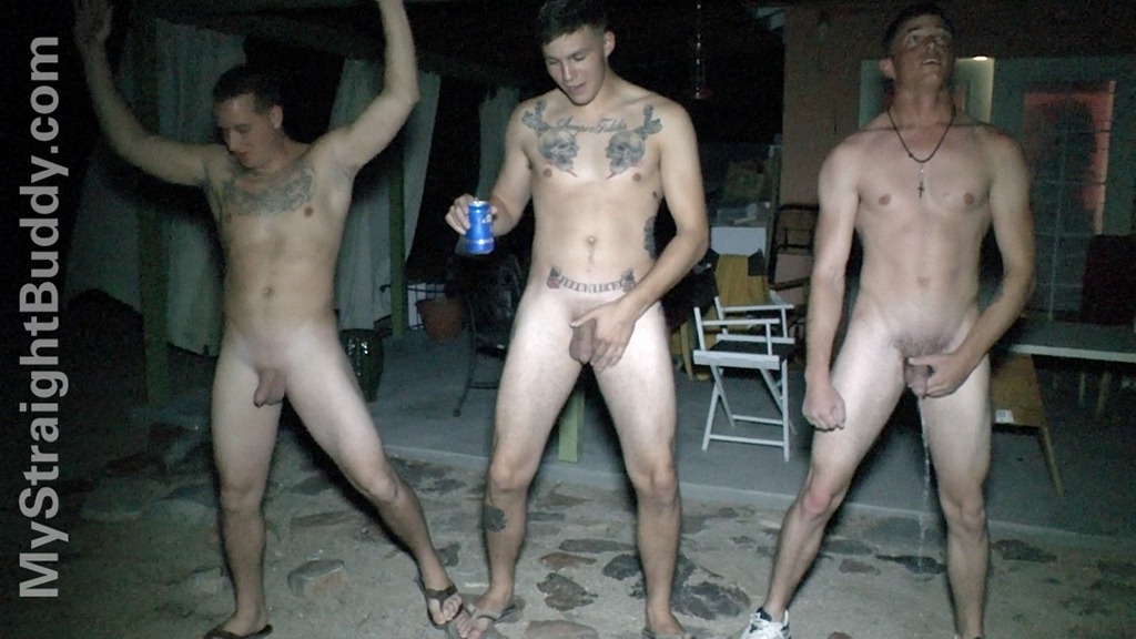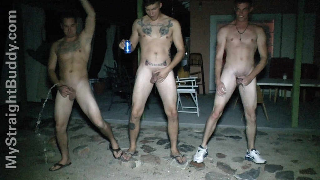 Joe’s buddies Mark, George and Cole were hanging out and when Joe told them about some YouTube videos he had found with guys playing naked Guitar Hero, they thought that sounded like fun. The fact that they were all drunk probably didn;t hurt either. Once their competitiveness was brought out they were all about the contests. First a pissing contest outside, which George wins hands down. Then a jerk off contest–Mark doesn’t finish first but he finishes best, shooting such a huge load that it gets in his hair Something About Mary style. Afterwards they all pile into Joe’s bathroom for showers. these 3 hot marines are totally comfortable with each other pissing, jerking off, and showering with each other!